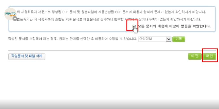 8. 최종 서류를 확인할 수 있는 페이지에서 다시한번 잘 작성하였는지 꼼꼼히 확인한 후 모든 문서의 내용에 이상이 없음을 확인합니다에 체크하고 확인을 누릅니다.