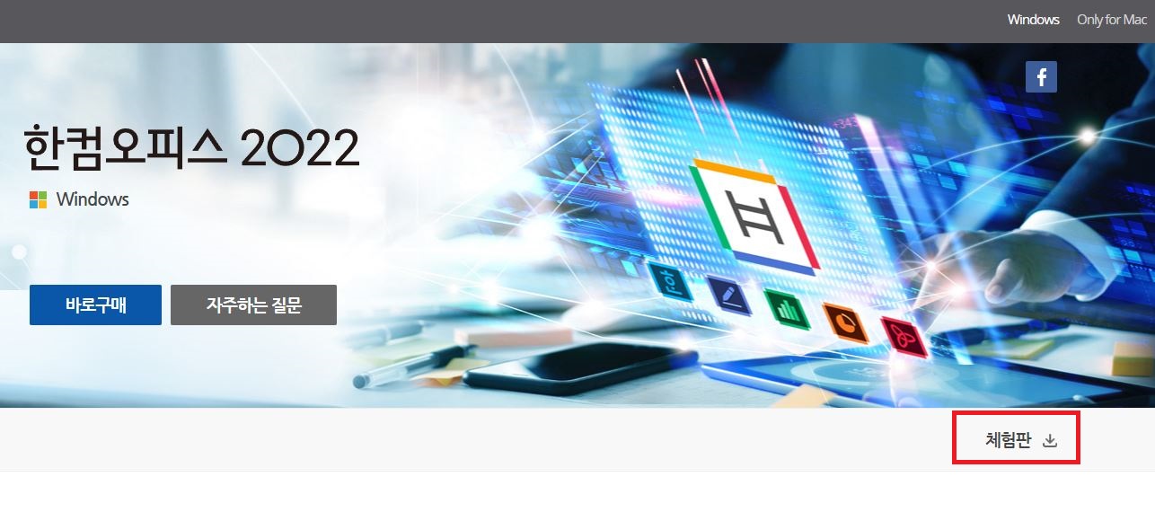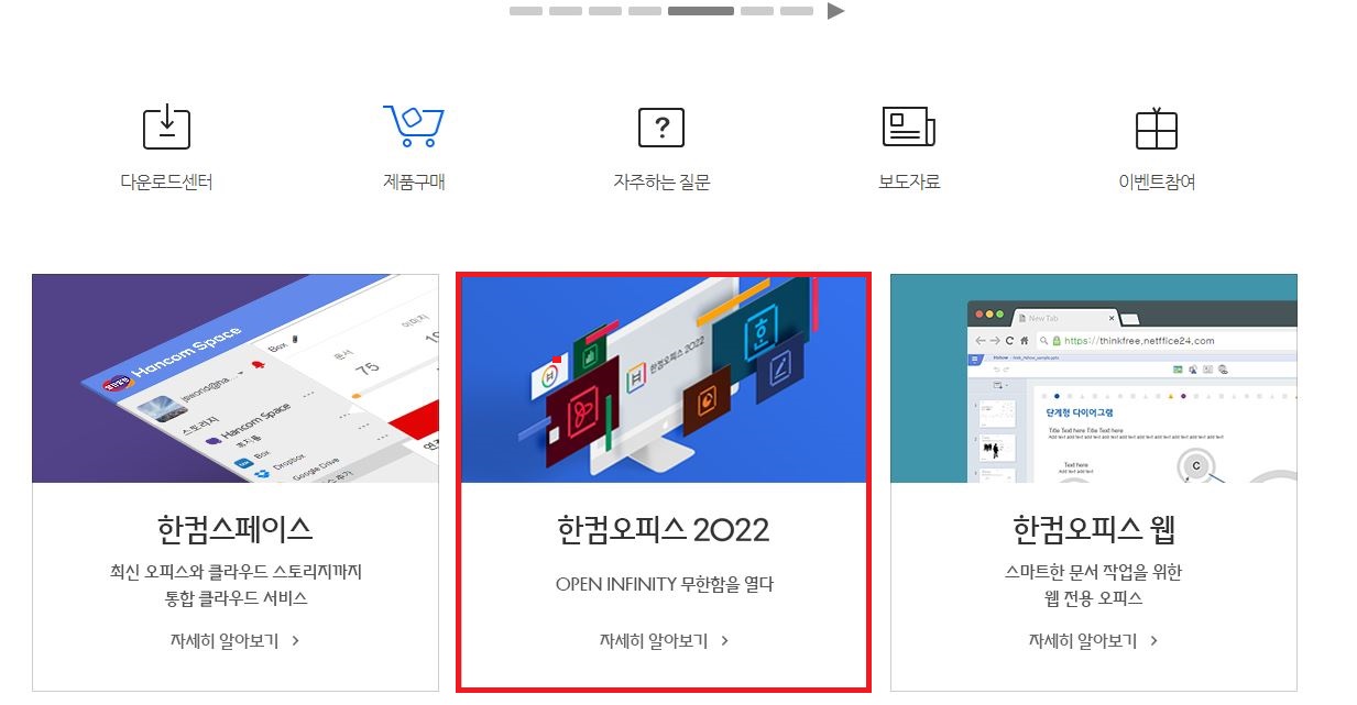 2. 공식 홈페이지 중간에 👉한컴오피스 2022👈 누른다