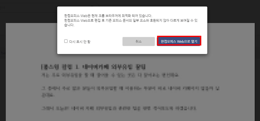 7. 내가 접속한 인터넷 창에 따라 경고창이 뜰 수 있습니다. 한컴오피스 web으로 열기를 클릭합니다.