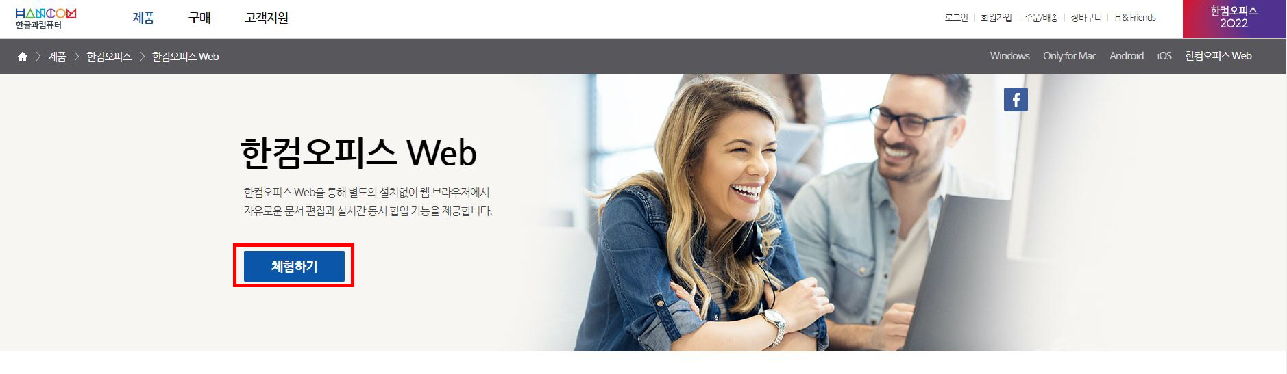 한글과 컴퓨터 홈페이지 > 상단에 제품 클릭 > 한컴오피스 클릭 > 한컴오피스 web를 클릭합니다.