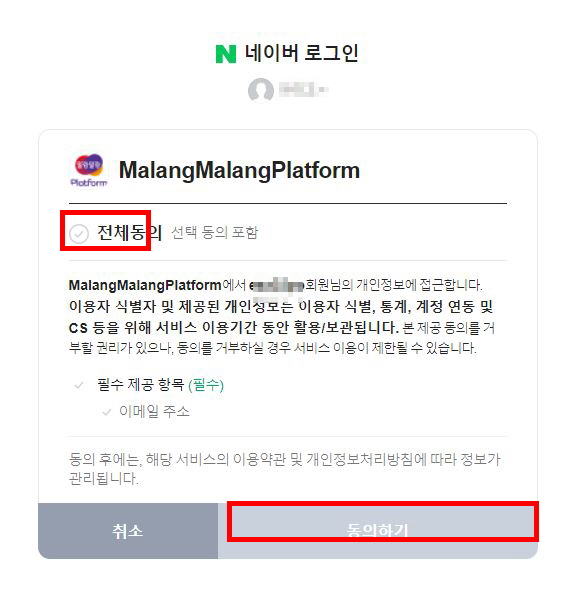 전체 동의를 누르고, 동의하기까지 누르면 로그인이 완료됩니다.